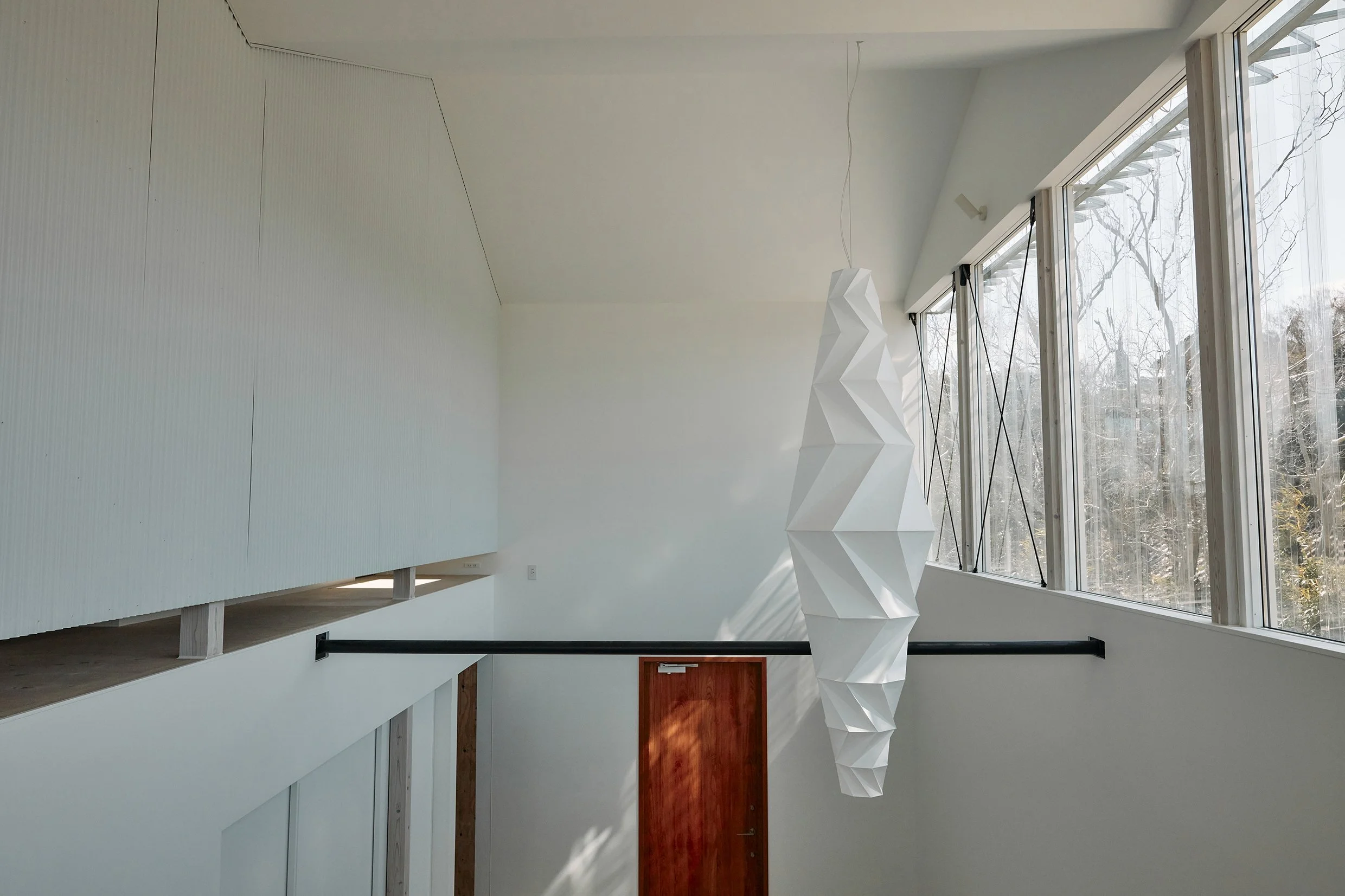 日中は建築の白と調和し、折り目の陰影が美しく表れます。